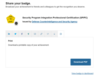 - After you receive and accept a digital badge on the Credly platform, you will be redirected to the “Share Badge” page. From here, you will have the option to share your badge directly from the Credly platform to various social media platforms and print your SPēD certification certificate for free.